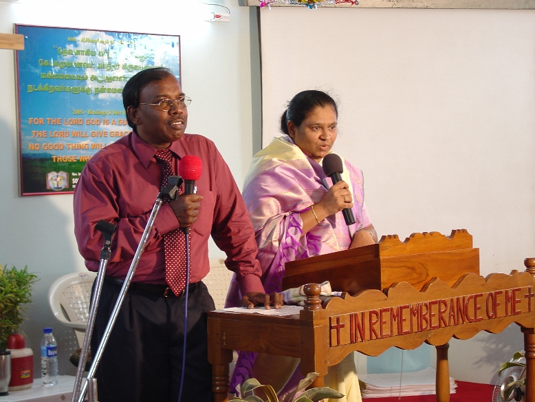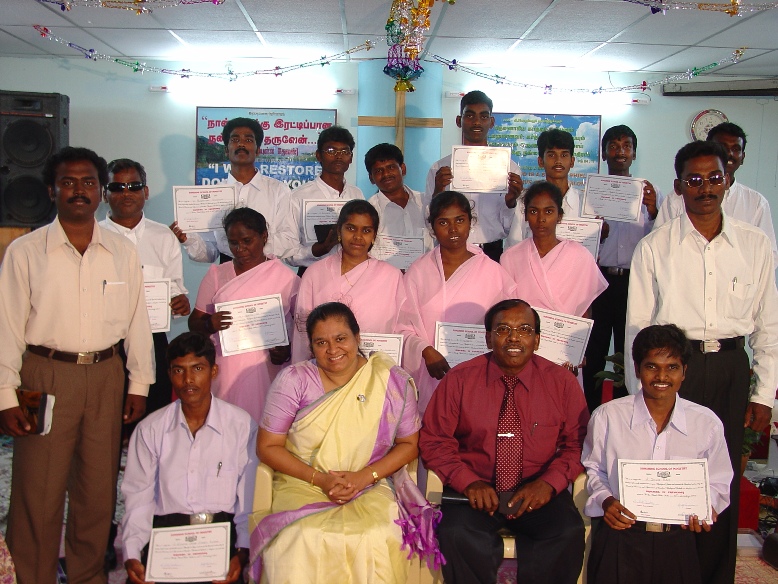 Pastor J.T. Norman and his wife Elizabeth oversee the Bible training center program and an orphanage located outside Tiruchappalli, India. This year we graduated 15 more students into full-time ministry. Two of the graduates were in a church service when the Tsunami struck their village. Though a fishing vessel broke through the wall of the church, no one inside the building was injured-while the village itself was destroyed, with many lives lost. The two graduates plan to return to their village to pioneer a new church ministry. These pictures show village church meetings, and graduation ceremonies.